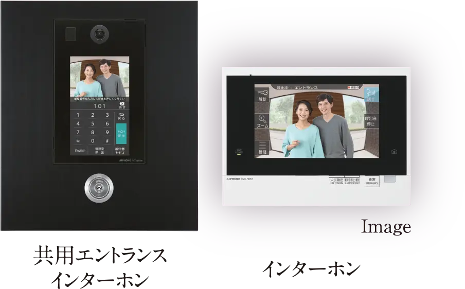 共用エントランスインターホンから、来訪者を映像と通話で、住戸玄関も通話で対応できます。また、宅配ボックスの着荷も室内にあるカラーモニター付インターホンで確認できます。住戸内の火災感知器が作動すると警報音を鳴動します。