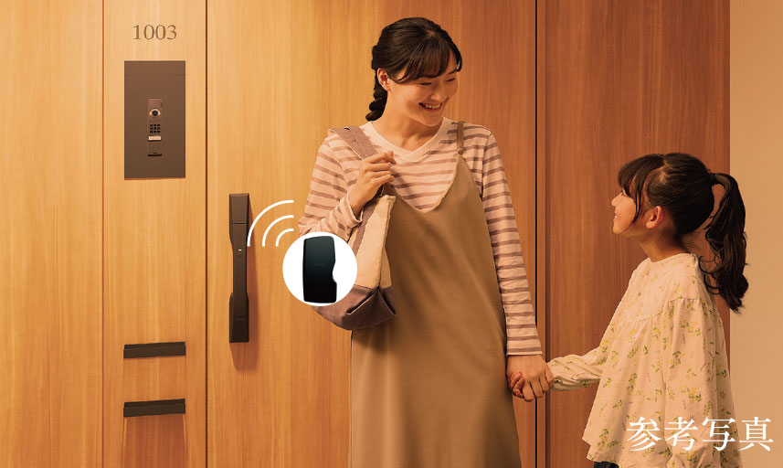先進のハンズフリーキー「Tebraキー」はポケットに入れたまま、ハンズフリーで共用エントランスのオートロックを、解錠できます。更に約42億以上の豊富なキーコード違いを持ち、高いセキュリティ性を確保しています。