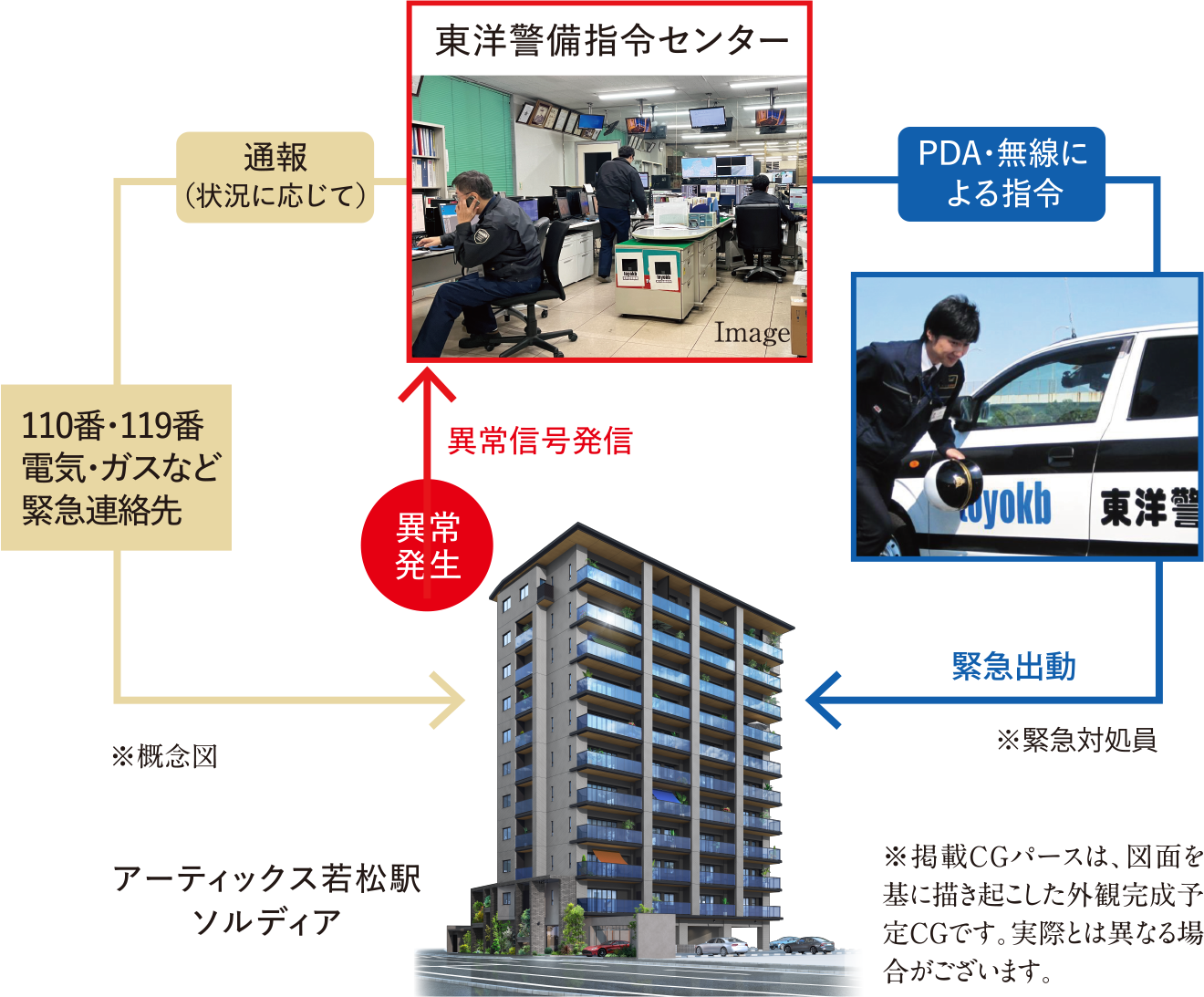 マンションの異常に素早く対応。プロの警備員が駆けつけます。マンションの火災・住居インターホン・エレベーターなどの設備の異常を監視。