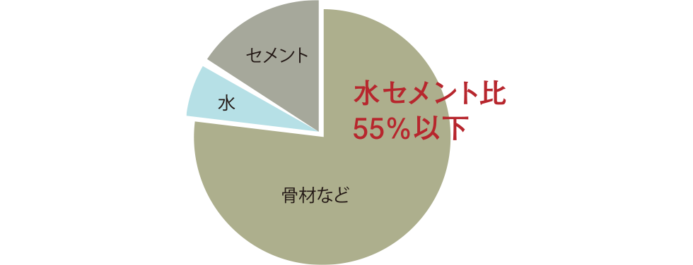 コンクリートはセメント・骨材と水を混ぜて造られます。コンクリートの強度を左右する指標のひとつが、コンクリートの調合(配合)におけるセメント量に対する、加える水の量の重量比。数字が低いほど、すなわち水の量が少ないほど密実な、強度の高いコンクリートになります。「アーティックス若松駅ソルディア」では水セメント比を55%以下に設定する事で、コンクリートの収縮を低く抑え、ひび割れも起こりにくい、耐久性の高い建物を実現する事ができます。