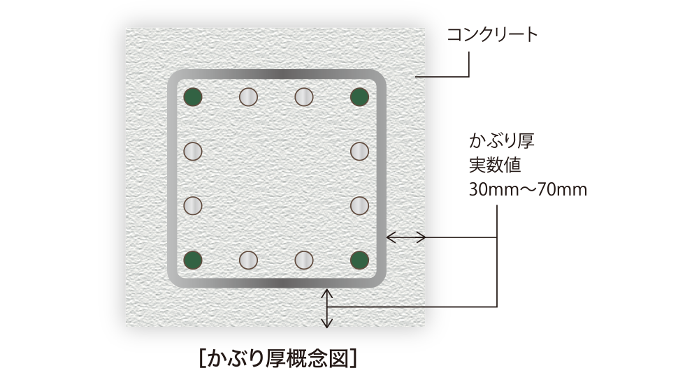コンクリートはアルカリ性ですが、空気にさらされると炭酸ガスなどと化学反応を起こして中性化が進み、コンクリートの中の鉄筋を錆びやすくしてしまいます。これを抑制するために、鉄筋を包むコンクリートの厚さ(かぶり厚)を、30〜70mmと厚めにとり、鉄筋を保護することで建物の耐久性を高めています。