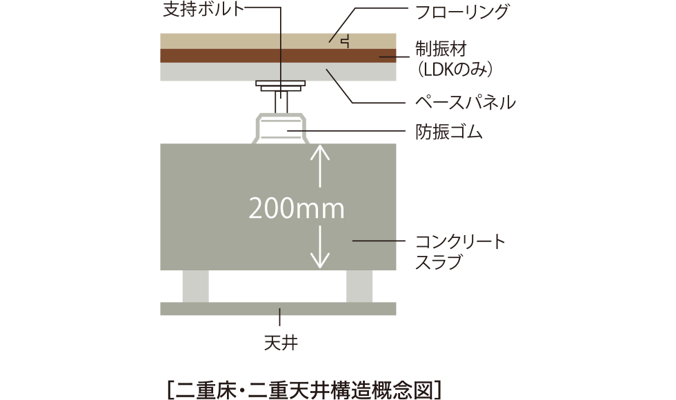 住戸間のコンクリートスラブは200mmの厚さを確保しています。防振ゴム付きの支持ボルトの上に床を作る二重床の工法です。床への衝撃を緩和して階下に音が伝わりにくくなると同時に、隙間に空間があることで優れた保温性を実現。天井はスラブの間に空気層のある二重天井構造です。二重床・二重天井構造は、メンテナンスやリフォームも容易です。