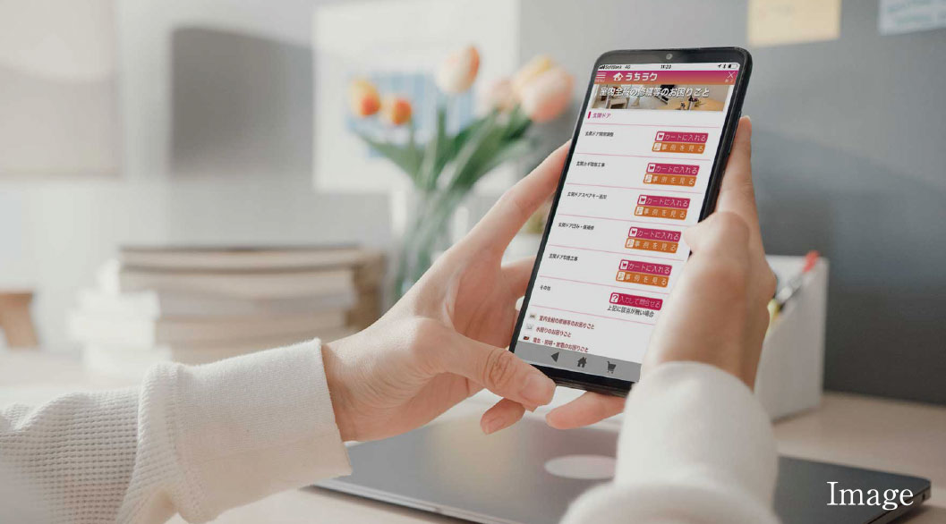 クロス・床などの補修や水廻りのトラブルなどの住まいのお困り事は、スマホアプリ「うちラク」で24時間受付可能。面倒な電話でのお問い合わせも不要です。