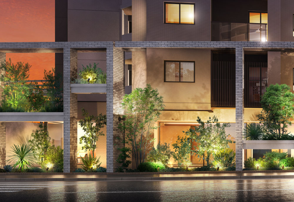 質感ある素材を格調高く配したデザインウォールとダウンライトの柔らかな光が奥行きを与える道のりは、歩みを進めるほどに美しき陰影が深まり、その先の邸宅へと期待を高めます。