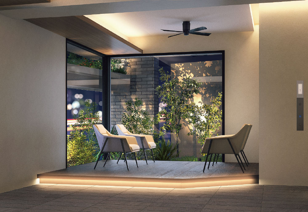 グラスウォールを透けて輝く柔らかな陽射し、木調マテリアルが醸すやすらぎと品格。