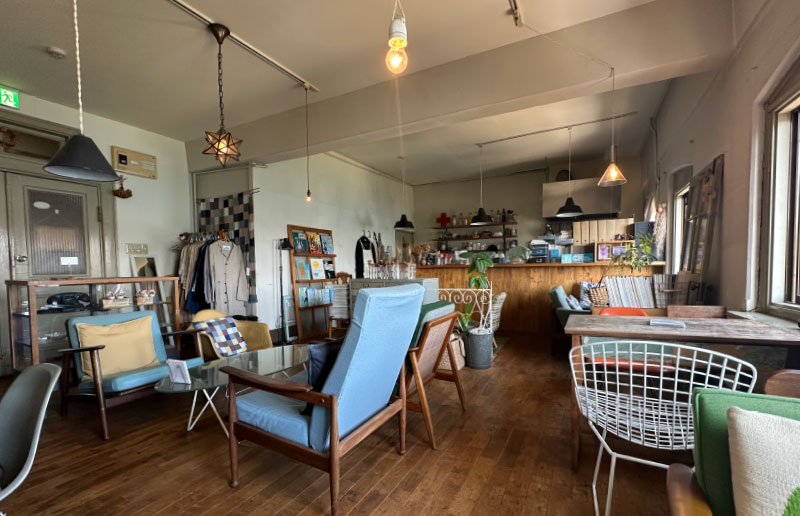 大正時代築の歴史ある「上野海運ビル」3階に位置する、隠れ家的カフェ。レトロで落ち着いた雰囲気で、木製家具とステンドグラスが彩る空間は、海風を感じながらゆったり過ごすのにぴったりです。