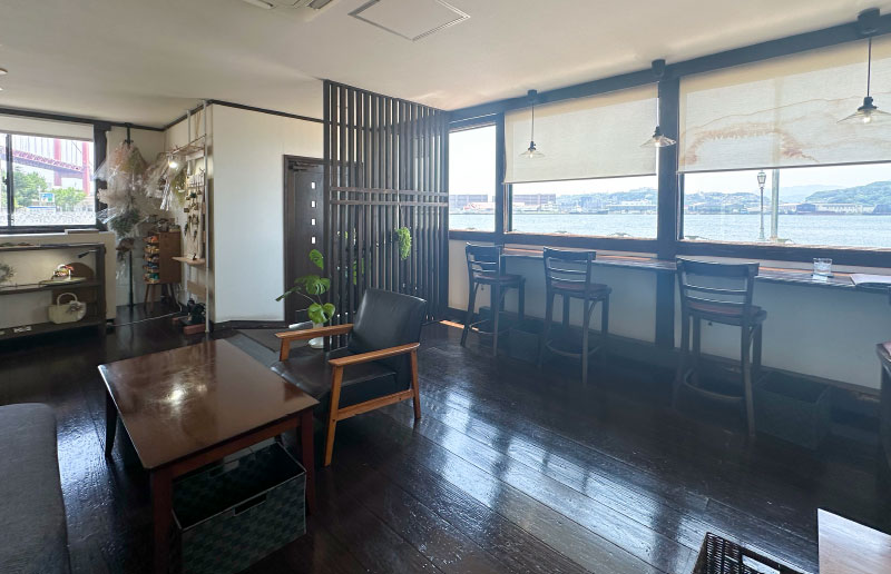 若松南海岸通り沿い、洞海湾の絶景を望む小さな隠れ家喫茶店。一人または二人で静かに過ごすのにぴったりです。落ち着いた空間。窓際からは海と山、時にはスナメリまで眺められ、潮風と共に心地良い時間が流れます。