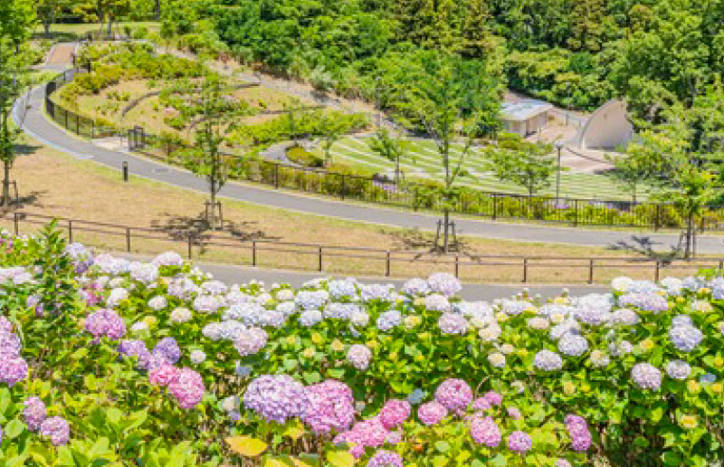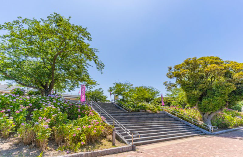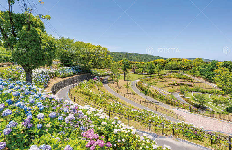 春の桜や初夏のアジサイなど四季の花々が楽しめ、特に約7万株のアジサイが咲き誇る「あじさい祭り」は地元の風物詩として親しまれています。展望台からは若戸大橋や洞海湾を一望でき、工場夜景は「日本夜景遺産」にも認定。歴史的遺構や遊歩道、音楽堂、イベント広場もあり、散策・レジャー・観光に最適なスポットです。