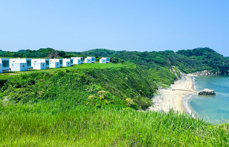 玄界灘を望む、開放感あふれる若松北海岸のプライベートビーチ。白い砂浜と透き通る海が広がる穏やかなロケーションで、波音と海風に包まれながら過ごすひとときは、まさに非日常。隣接するグランピング施設「TOMORROW COAST」の利用者を中心に、海辺での散策や夕陽鑑賞、ビーチヨガや焚き火イベントなども楽しめる空間です。日常を忘れて、ただ海と空を眺める。そんな贅沢な時間が流れています。