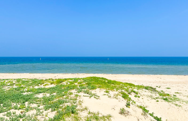 玄界灘に面した白砂のビーチが広がる、若松区を代表する海水浴場。遠浅で透明度の高い海は、小さな子ども連れでも安心して楽しめるのが魅力です。釣りやマリンスポーツを楽しむ人々にも人気。木製デッキや広場も整備され、海辺の散策やピクニックにも最適。すぐそばの汐入の里では、幼いお子様でも安心の人工海浜や複合施設「SIOIRI」も。開放的なテラスで潮風を感じながら過ごせるカフェは、地元食材やドリンク、焼きたてのパンが楽しめ、日帰りの立ち寄りにも最適です。