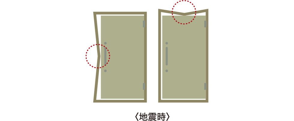 クリアランスを大きく確保することで、地震などで局部変形(赤丸部分)を受けても、枠とドアの接触を緩和させ、女性の力でも内側からドアを開けることができます。上下のクリアランスも大きく確保し、面内変形を受けても同様の作用でドアの開放が容易になります。