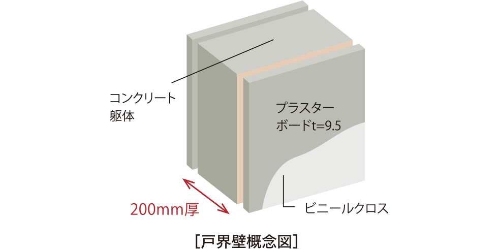 隣戸間の空気伝搬音の伝わり方は、戸界壁の構造と厚さが主に関係しています。そこで「アーティックス若松駅ソルディア」は、戸界壁をコンクリート厚200mmを確保し、遮音性の高い造りとなっています。