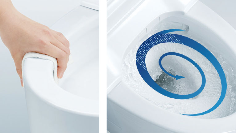 渦を巻くような水流とフチがない便器で汚れにくくお掃除ラクラク。